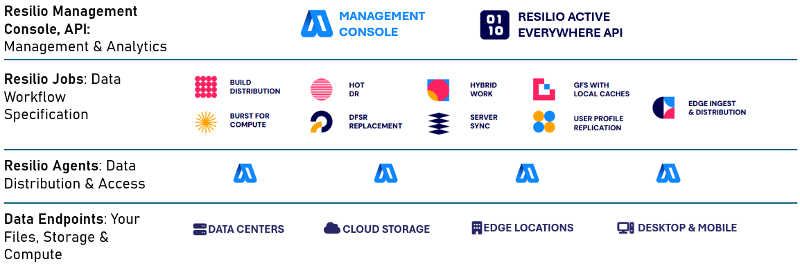 Data transmission is facilitated by Resilio Agents - lightweight services running on endpoints which participate in transfer jobs according to instructions they receive from the Management Console.