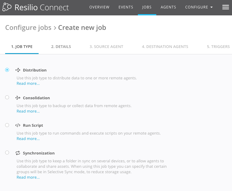 Resilio Connect solves a number of data delivery tasks offering a simplified flow for each case. Each task is fulfilled through a corresponding job