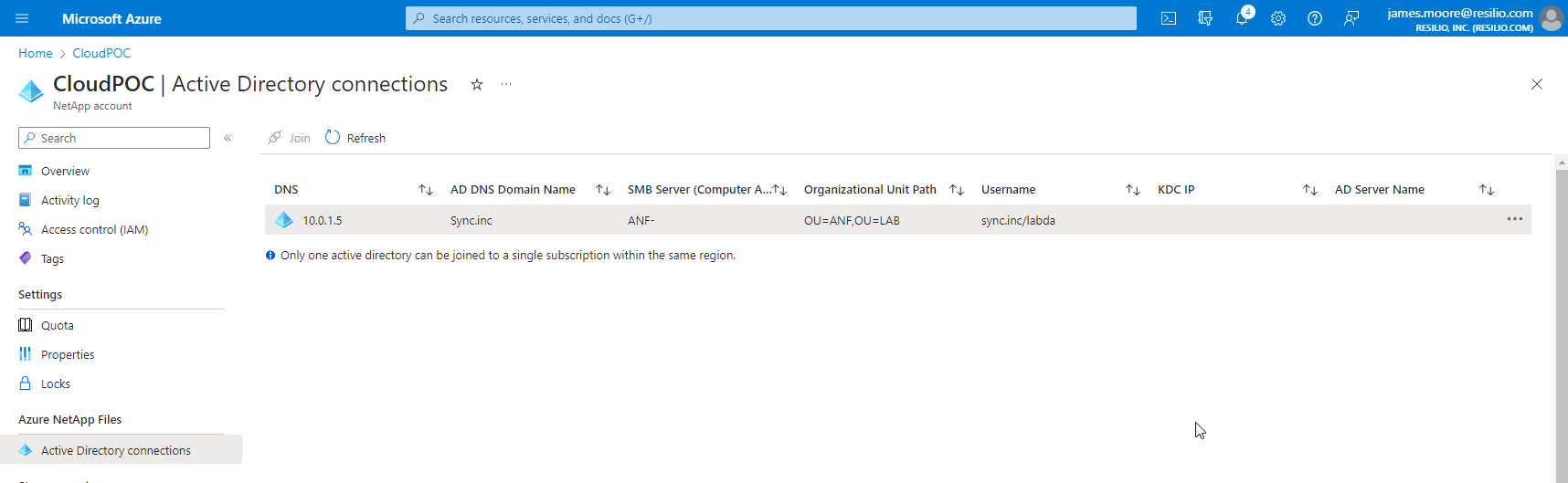 - Find your Active Directory mount for the ANF instance.