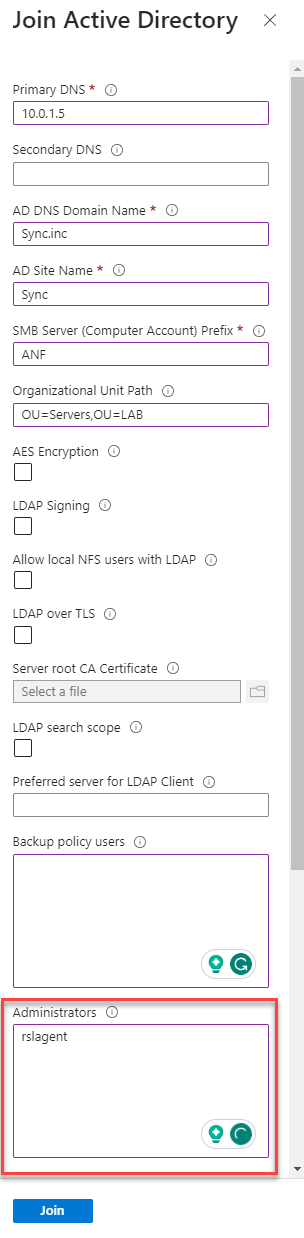 When working with Azure Netapp Files, the service account for the Resilio Connect agent must be added to the built-in user account for the Azure Netapp Files.Use the following step to validate that an account has access or needs to be added. These steps must be repeated if there are multiple ANF Storage appliances.
