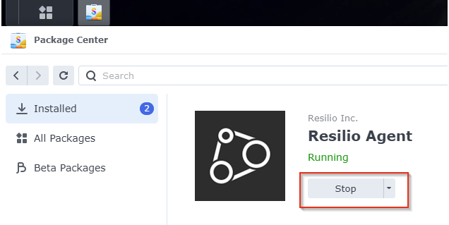 Step 2 - Go to the Synology Package center and stop the current Resilio Agent.