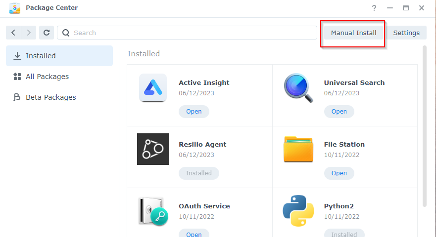 Step 3 - While in the Package Center click " Manual Install" in the top right part of the screen.