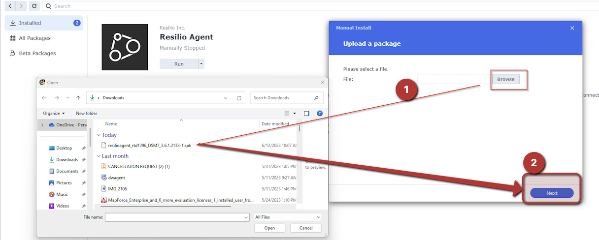 Step 4 - Choose the new Resilio Connect Agent package that was downloaded from the Resilio Connect URL Synology agent page. Then click "Next".
