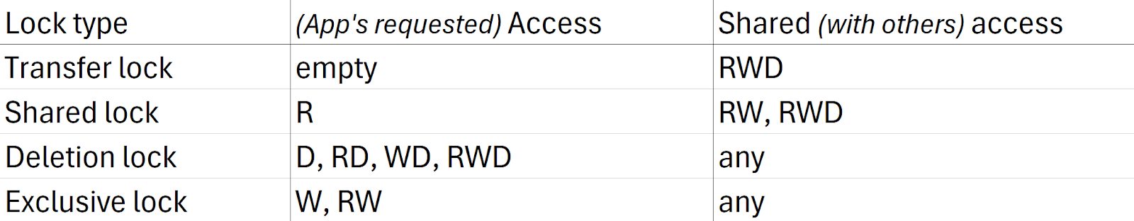 Lock type depends on the application with which the file is opened. Not all applications implement requested access to the files or only implement full access. To interpret the lock type and app’s requested access, refer below, where RWD stands for Read-Write-Delete: