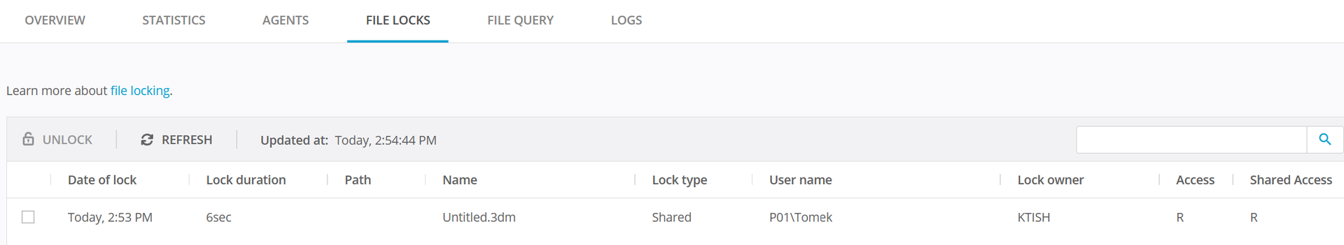 This read-only lock prohibits further file modifications, and subsequently, the existing Rhinoceros file opens will not be visible in the list of Resilio File locks. To view and manage the Rhinoceros file locks from the Resilio Management Console, add the custom parameter shared_locks_strict_access_checks:false to Job Profile.