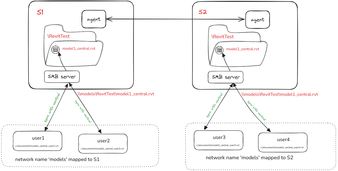 The central model (model1_central.rvt in the examples below) is replicated between locations using Resilio Agents in a job with File locking enabled.