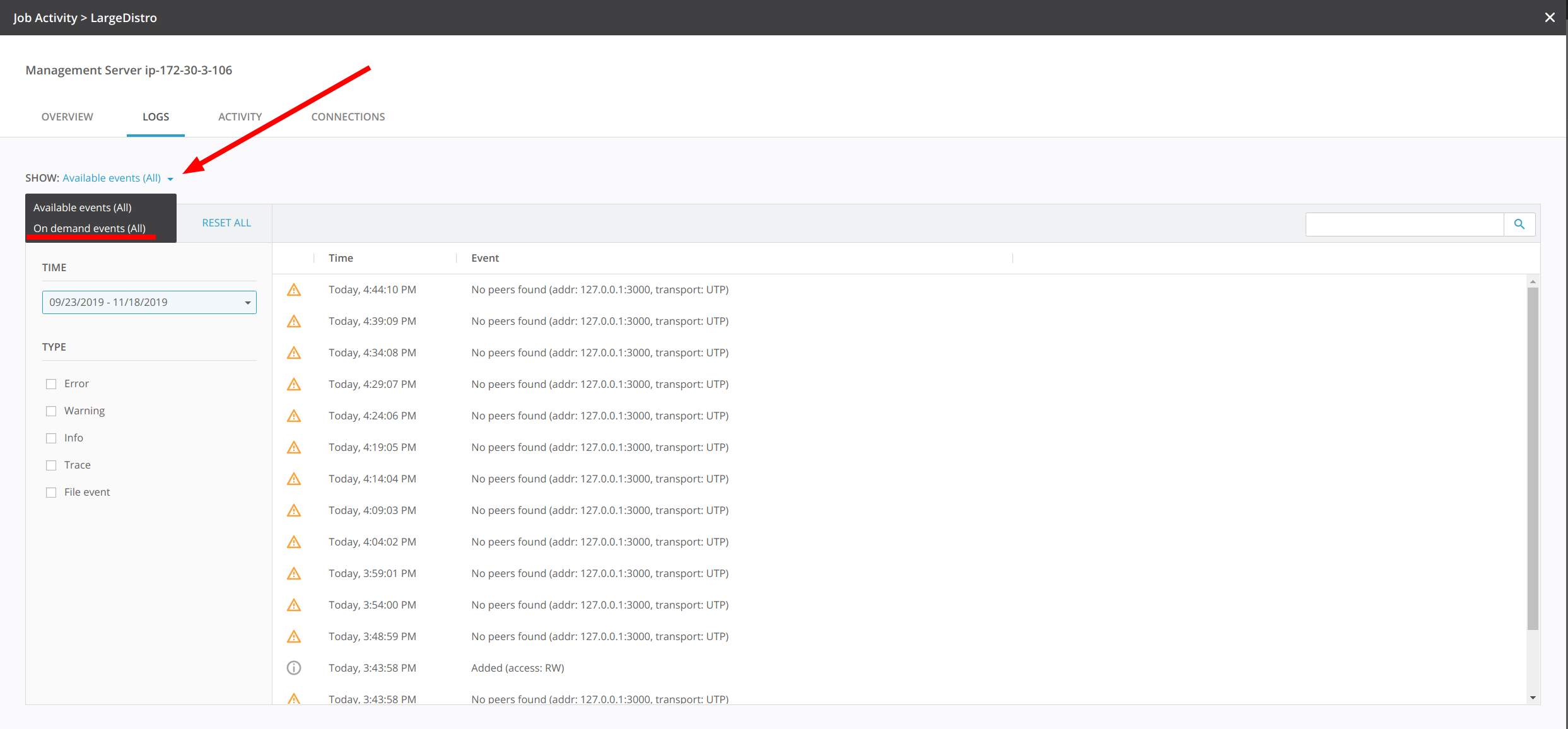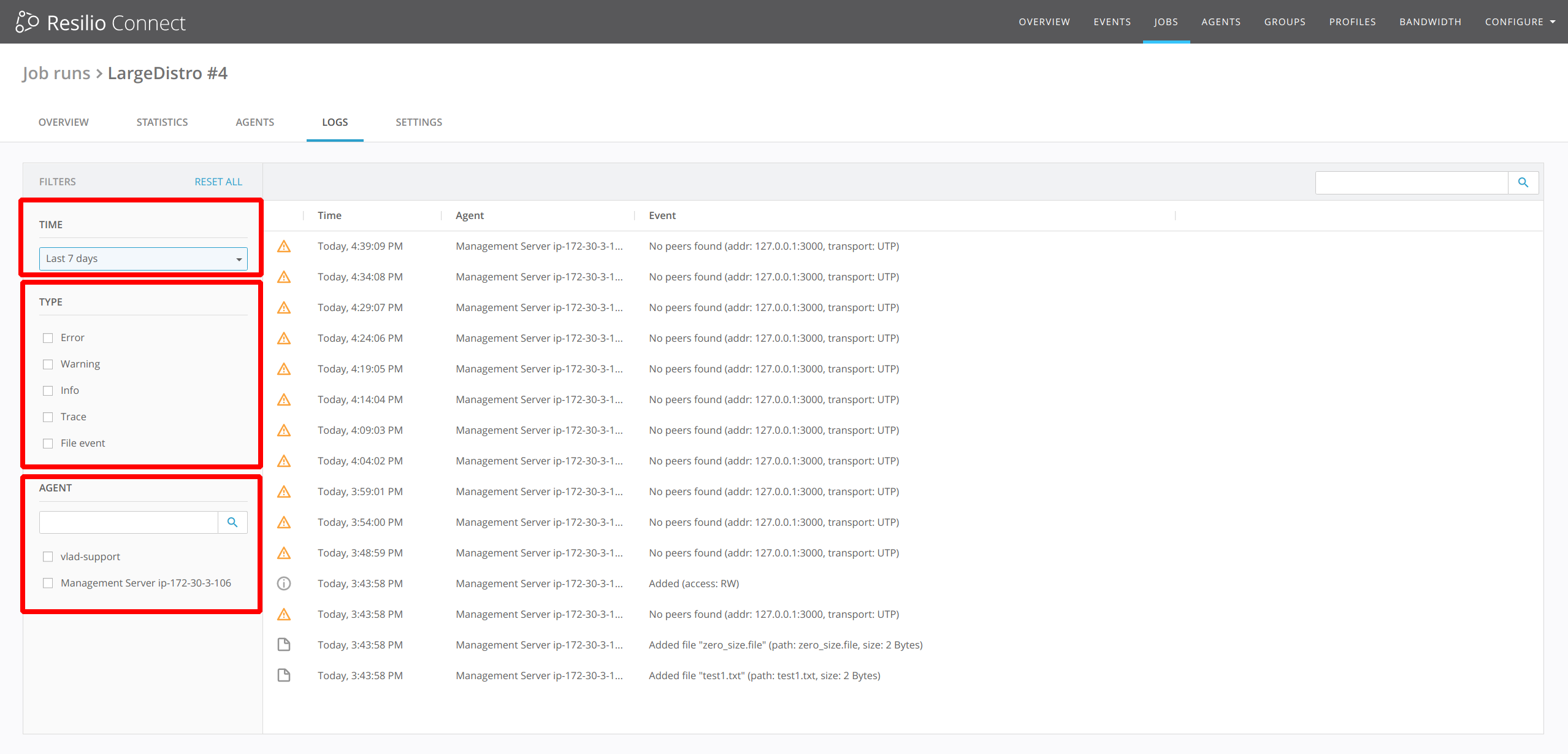 Starting with Resilio Connect v 2.4.0, each agent records ongoing events and can show them in Management Console UI. Event logs are stored in 2 places:
