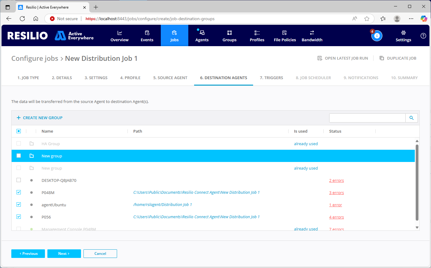 - Select individual destination agents or agent groups.