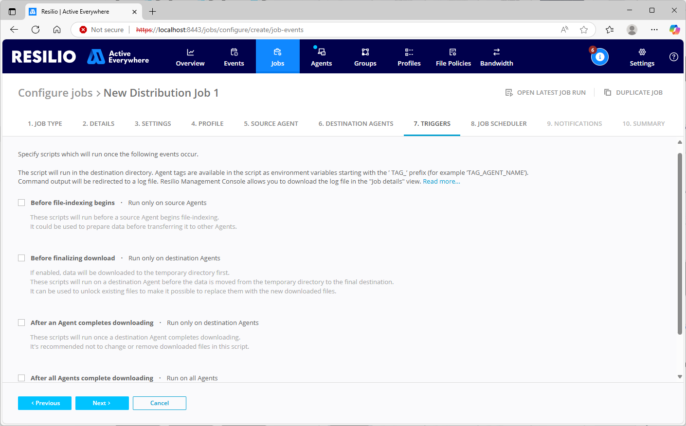 - Before file-indexing begins - When you create a Job, the first thing the source Agent does is indexing files in the specified folder. This option enables running a script before the indexing begins. The script can, for example, scan the folder and remove irrelevant, temporary files that are output automatically along essential artifacts.