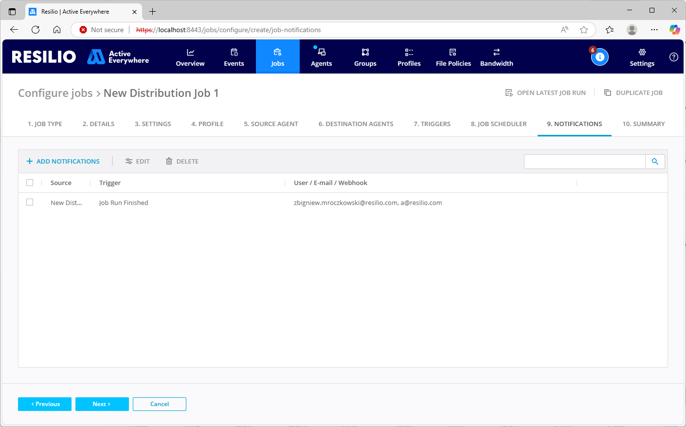 Note: You cannot enable the Job scheduler with the Choose on start option selected. - On the NOTIFICATIONS tab:
