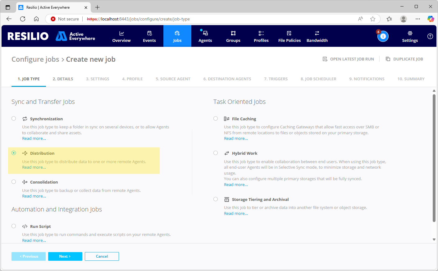 A Distribution Job is a one-time data transfer from a source endpoint to selected destination agents. A Distribution Job run can be launched manually or triggered automatically based on a predefined schedule. Distribution Job is commonly used for delivering software updates or important documents to remote workstations.