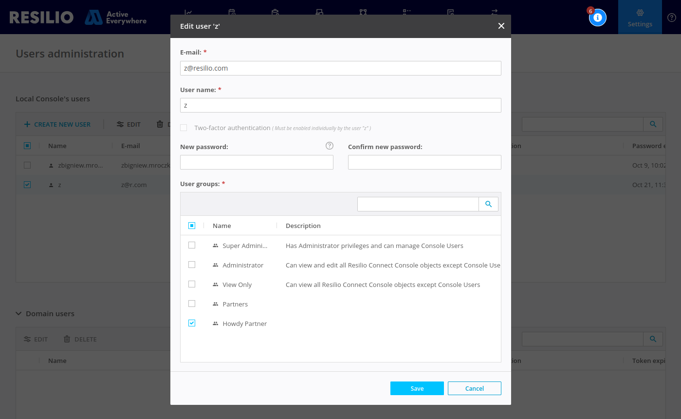 - In the User groups section, select a previously created partner group, then click Save.