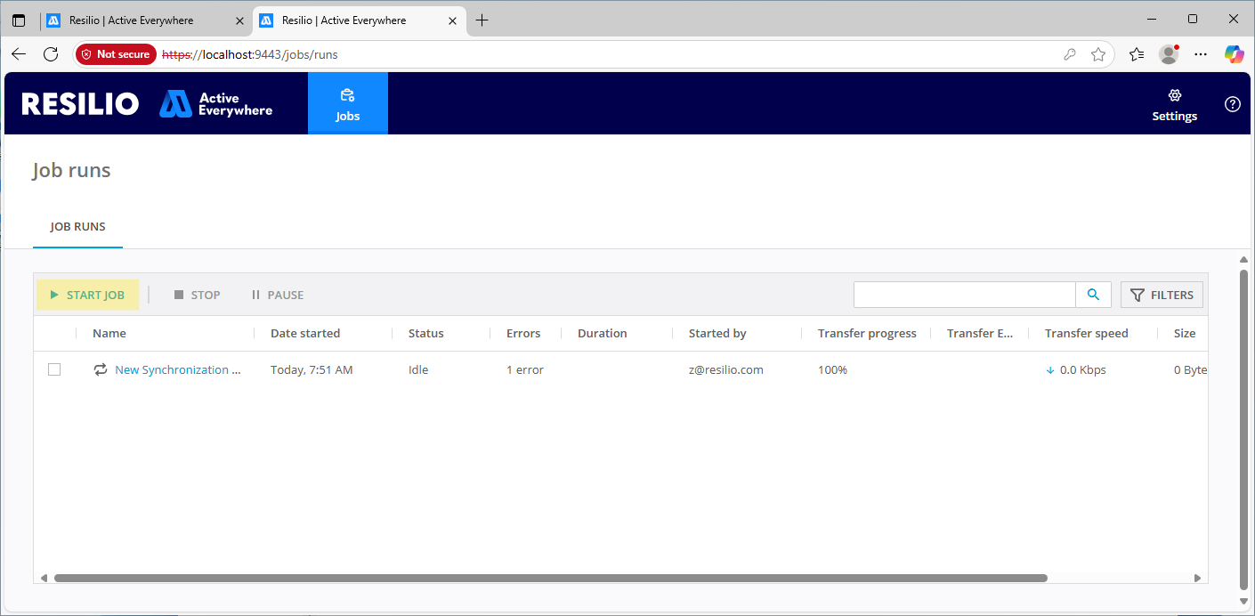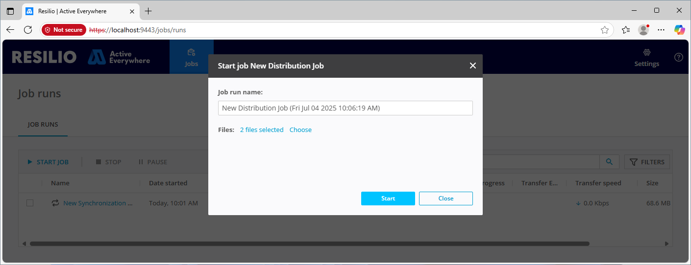 Tip: The Data Managers Console runs along the Management Console, but on a different port (default: 9443). - Click START JOB.
