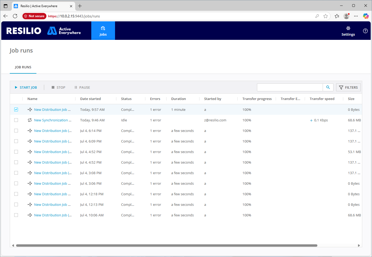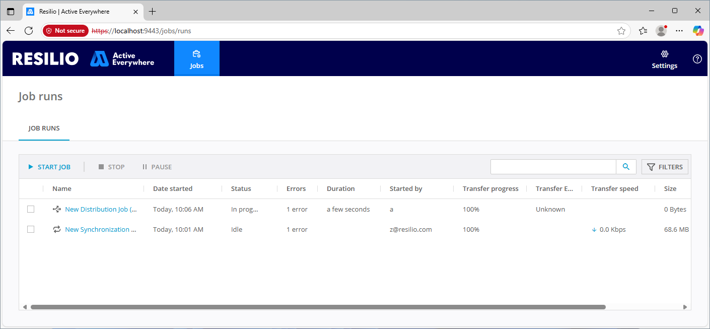 To monitor your distribution or synchronization job run, locate it on the JOB RUNS list, then click it to see its status and transfer statistics. Here you can monitor the currently running or previously completed job runs, start or stop a job run.