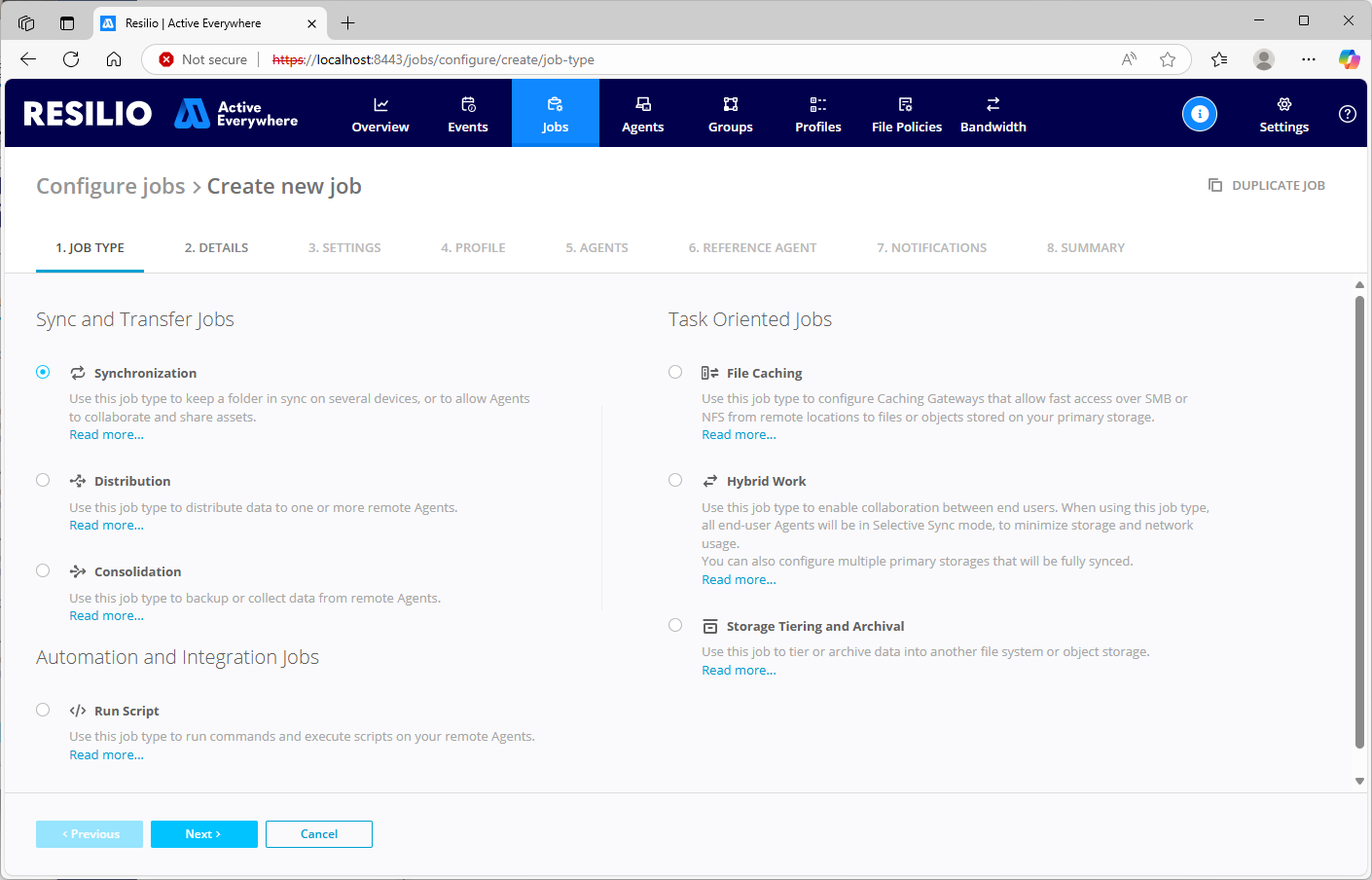 Synchronization Job is a continuous, two-way file transfer across multiple agents, or it can be set up as a one-way synchronization. It allows you to create an exact copy of a folder and its contents on multiple endpoints. Every change within the specified folder is instantly replicated across all participating agents. Use the Synchronization Job to create backups in real-time or facilitate a continuous files exchange. The Synchronization Job has only one Job Run.