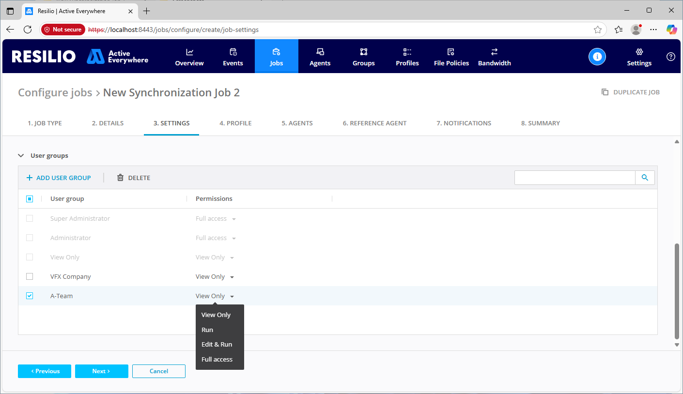 - In the User groups section, click + ADD USER GROUP, then select a group. Click Add and choose access level to the Job: