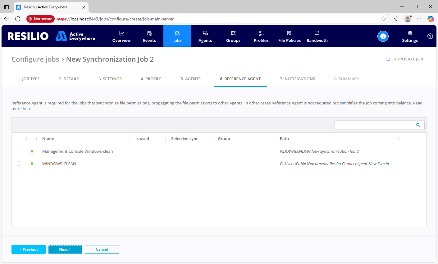 Note: Reference Agent is mandatory for Jobs configured to synchronize NTFS or POSIX permissions. In other cases, selecting a Reference Agent isn't necessary, but it can speed up the initial merging of contents of non-empty synchronization folders. Read-only Job participants cannot be Reference Agents, thus they're not available for selection. For more information, see Reference Agent. - On the NOTIFICATIONS tab: