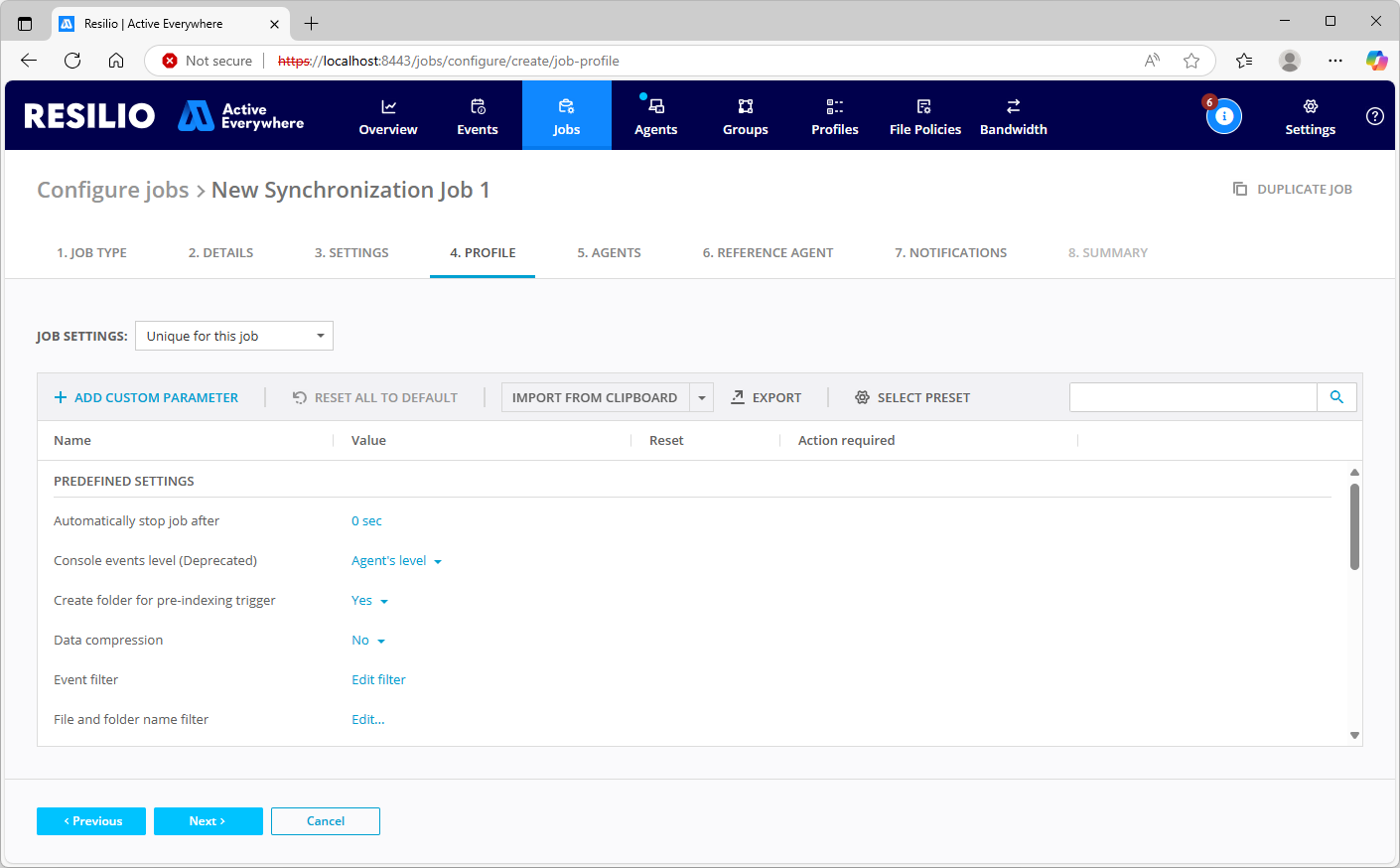 - On the PROFILE tab, select Job settings - a pre-defined set of parameters that fine-tunes the Job run, then click Next.